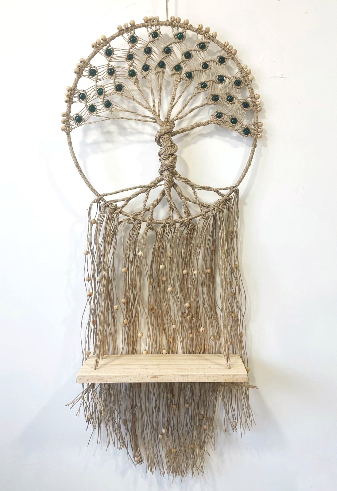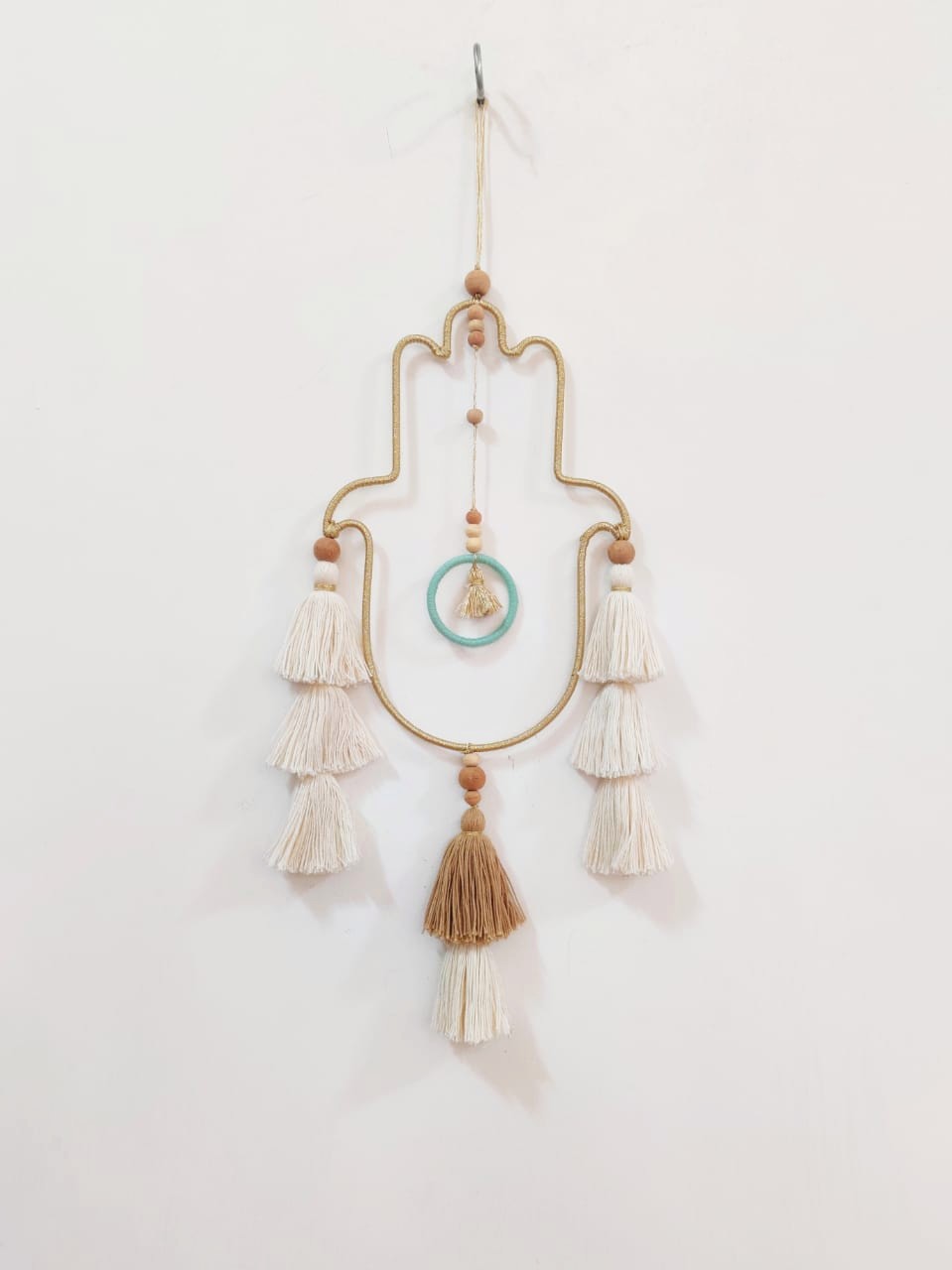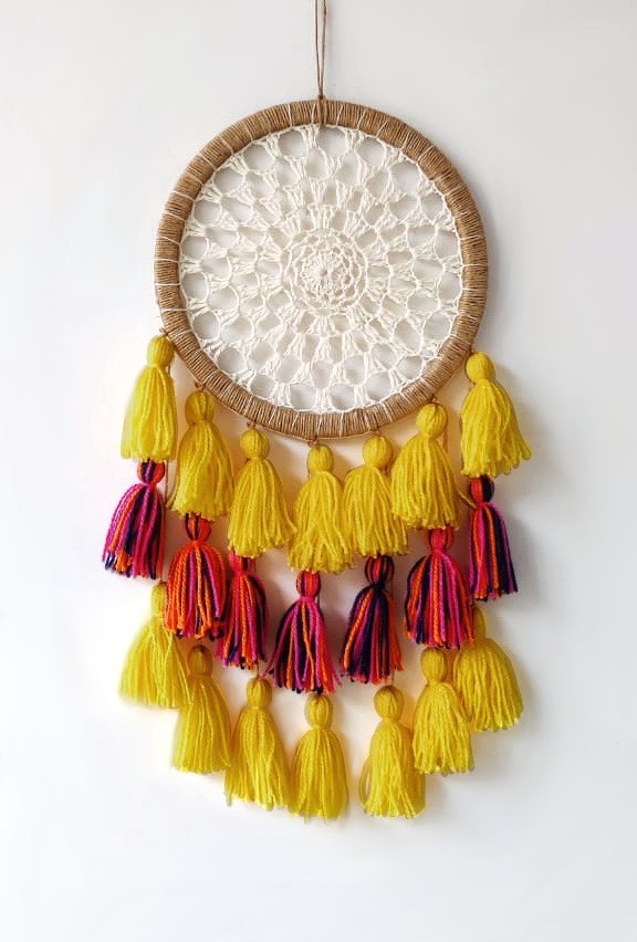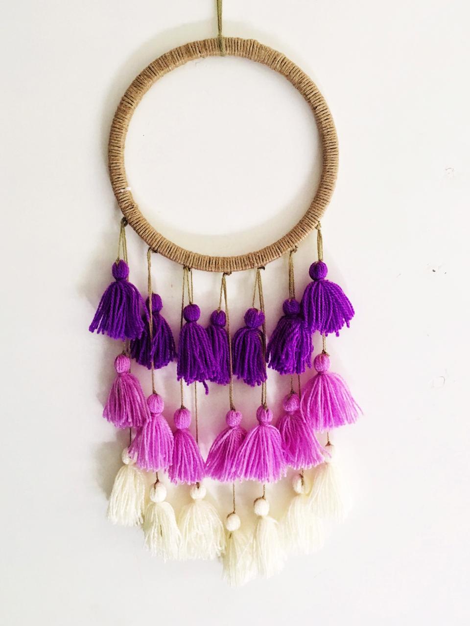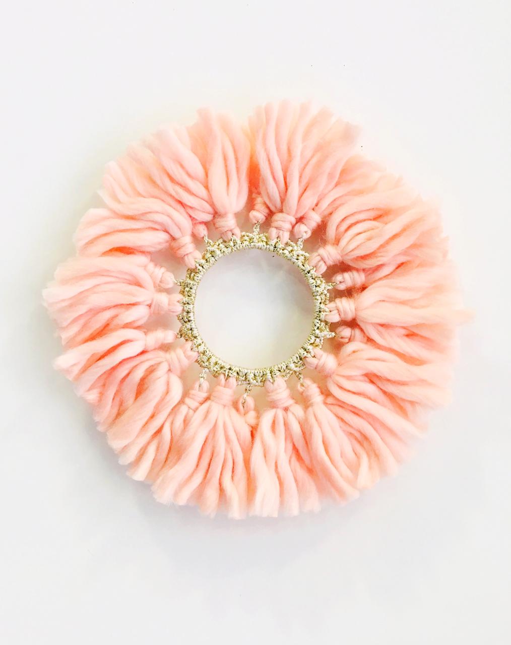 - Description: Wood ring wrapped with jute, 100% cotton crochet center blended wool tassels