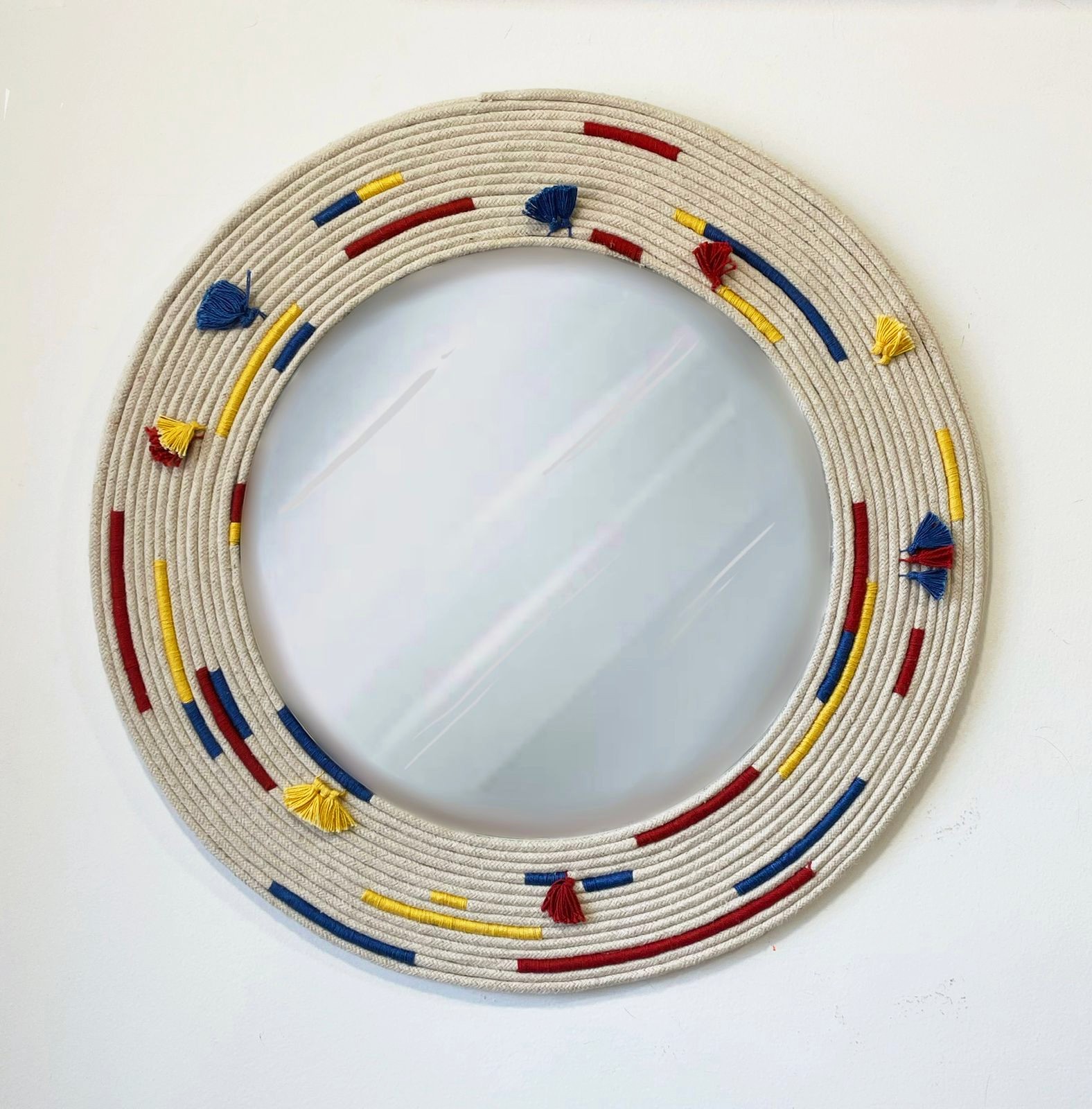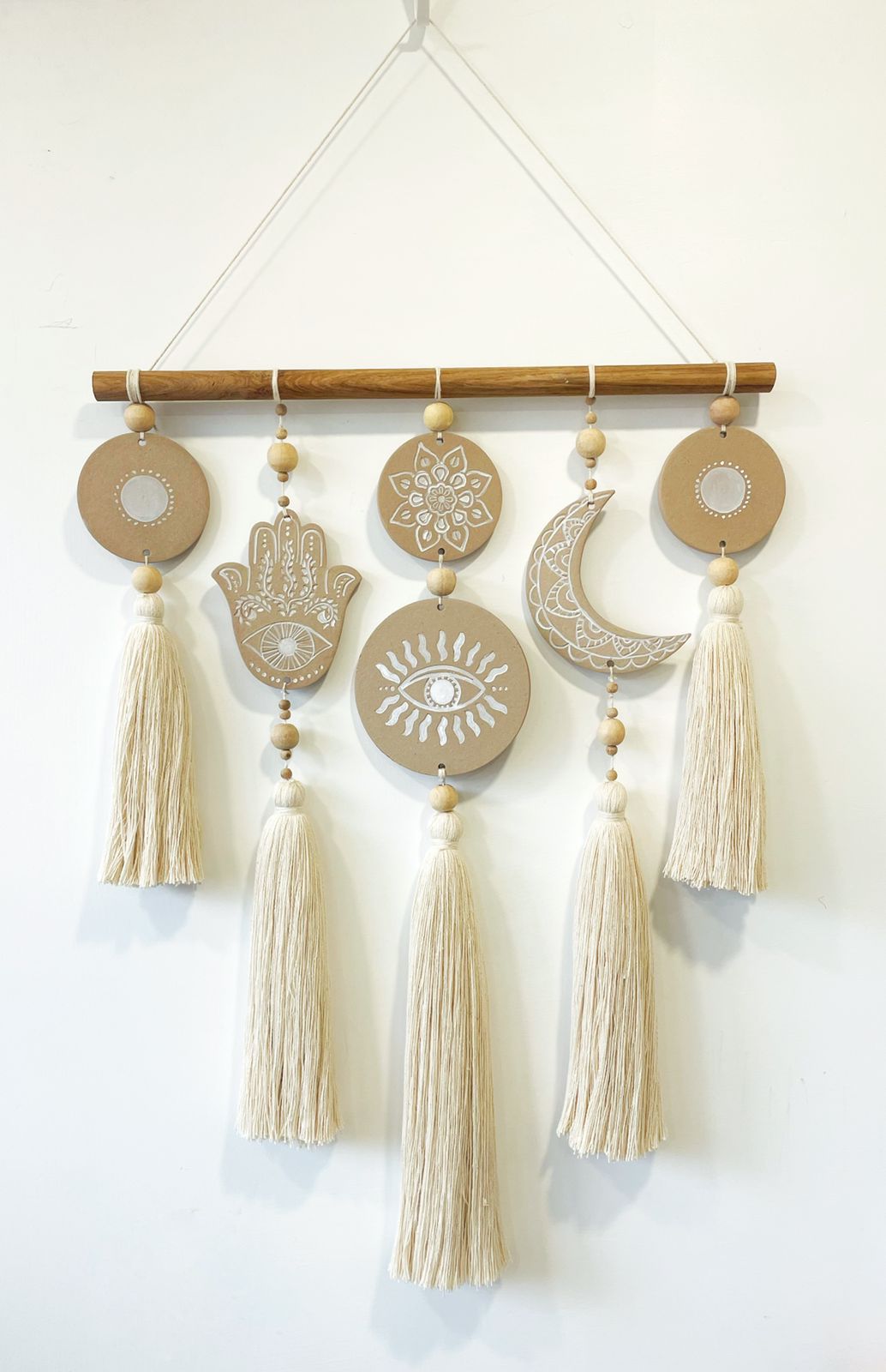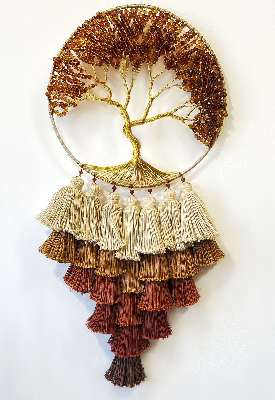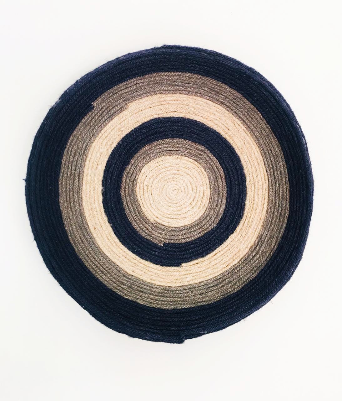 - Description: Wood ring wrapped with jute, 100% cotton crochet center blended wool tassels