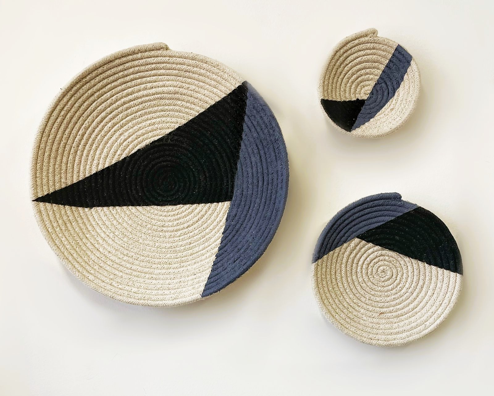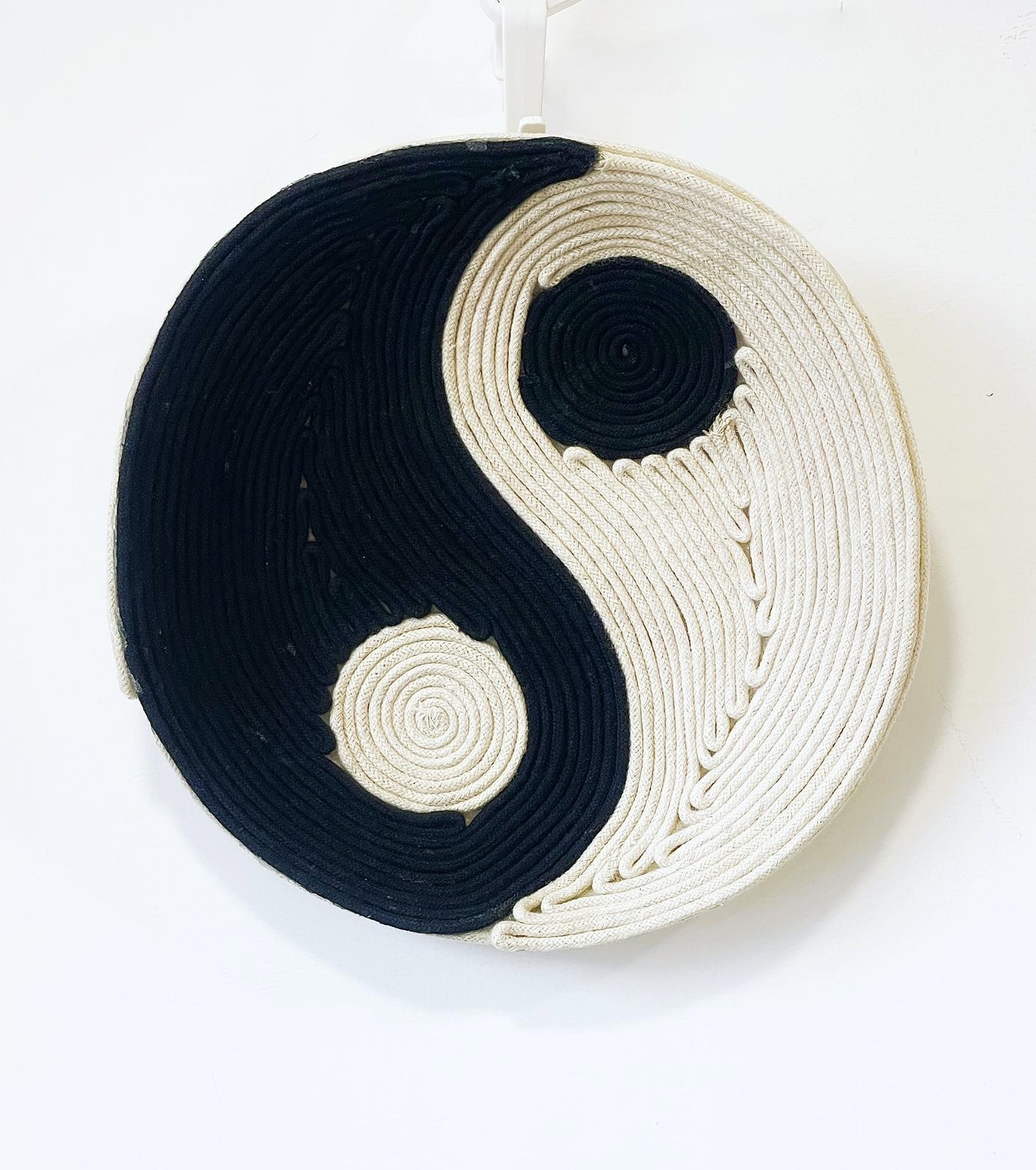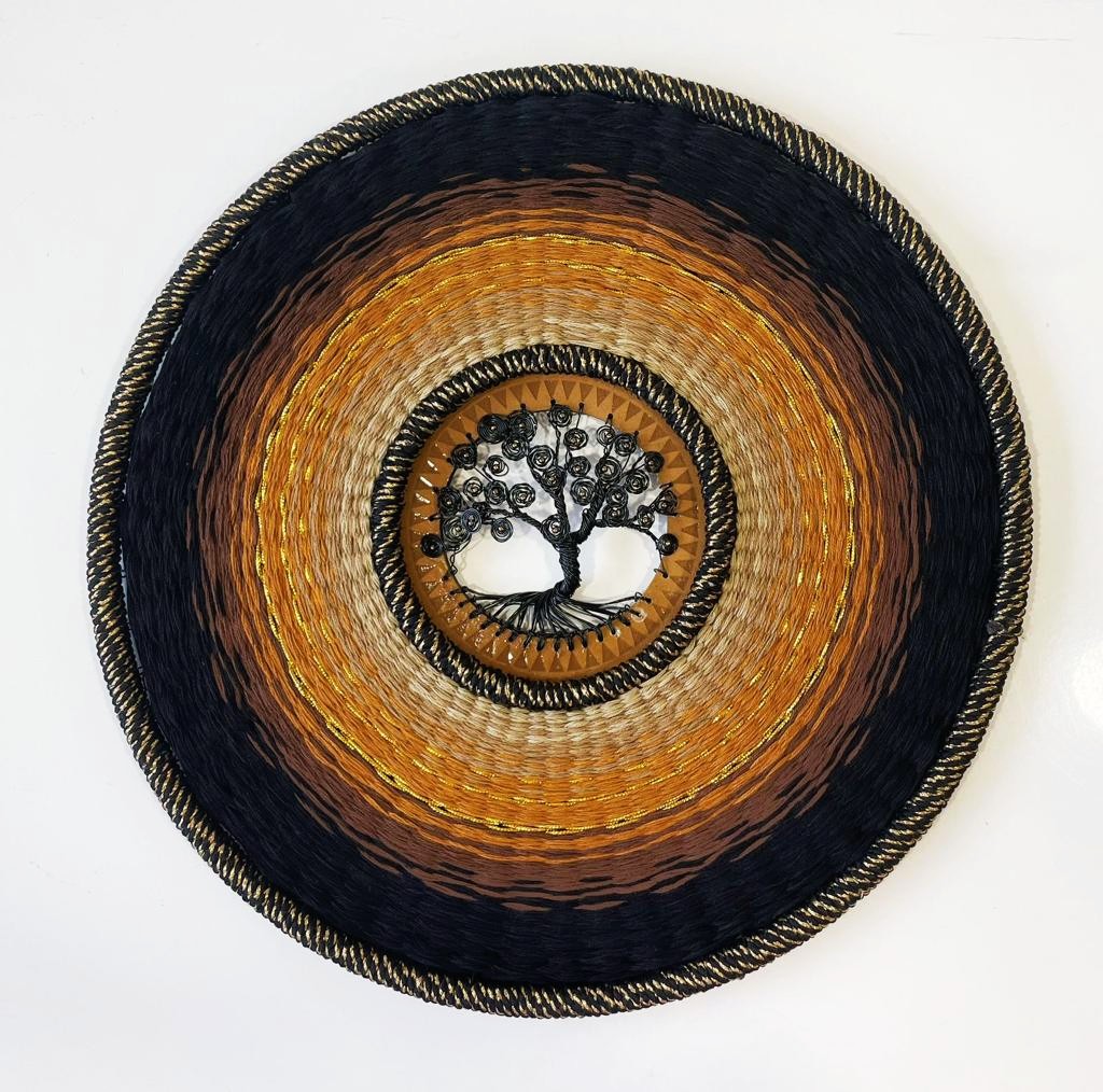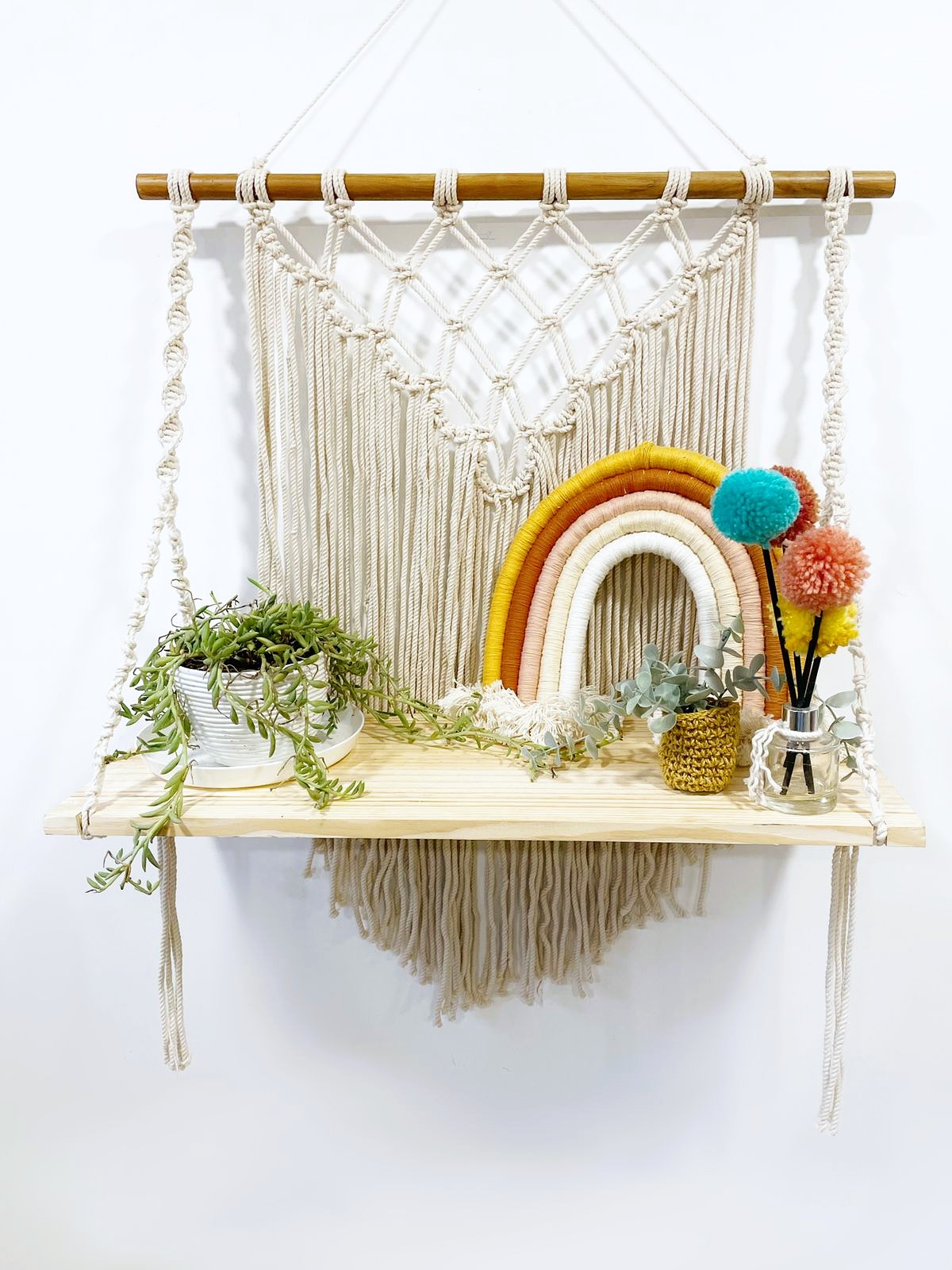 - Description: Wood ring wrapped with jute, 100% cotton crochet center blended wool tassels