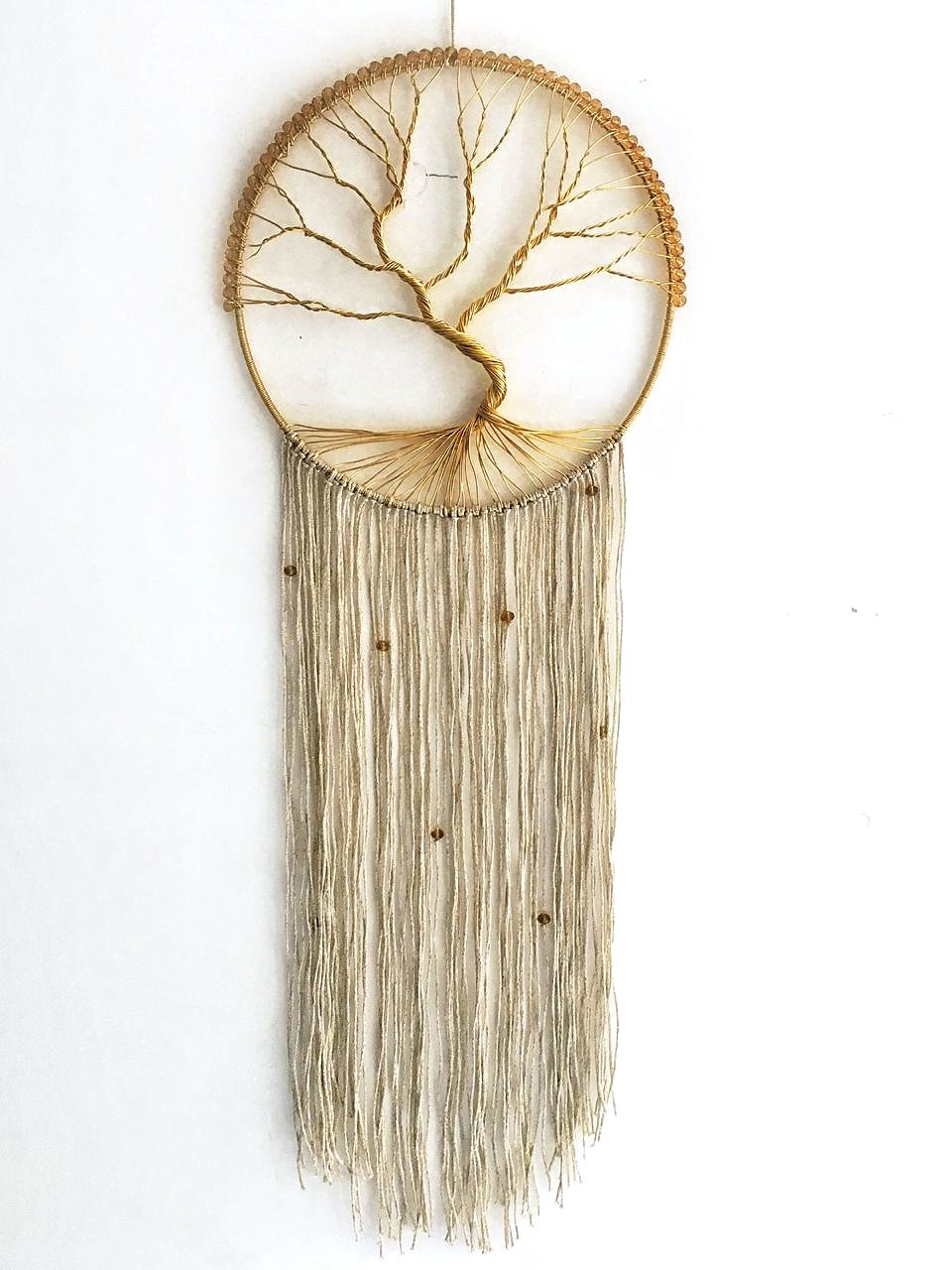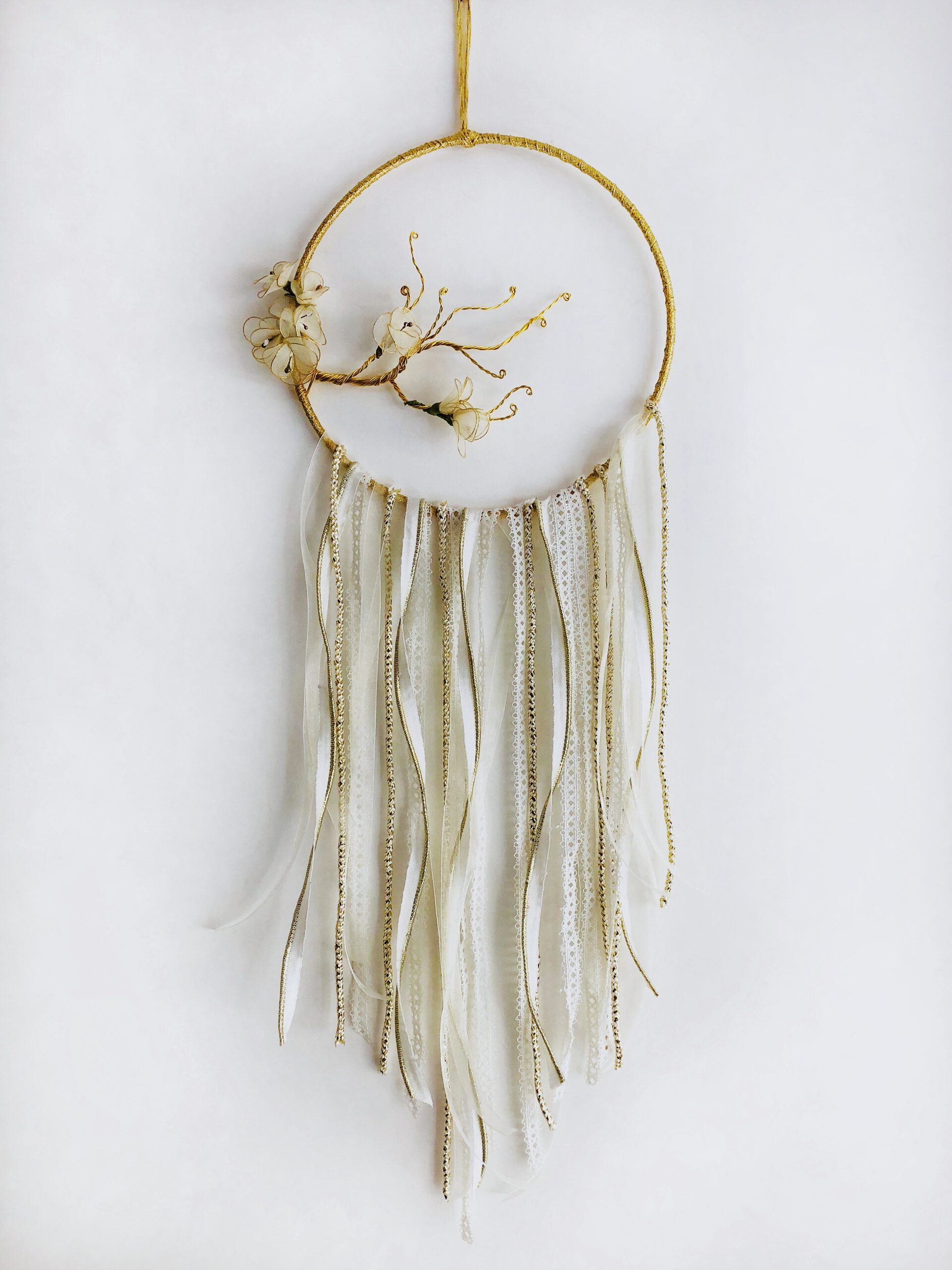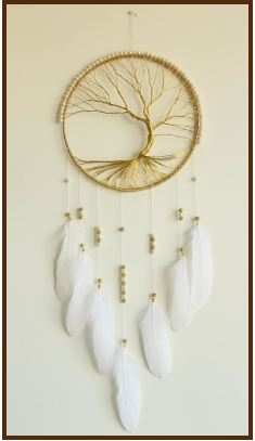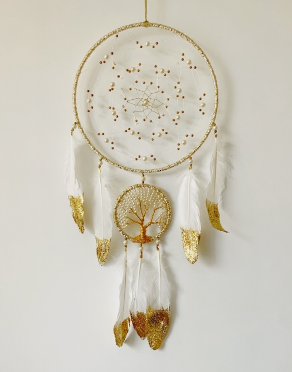- Description:Ring wrapped with gold yarn with faux pear web & metallic woven mini Bodhi Tree Dreamcatcher extension & faux gold-dipped feathers