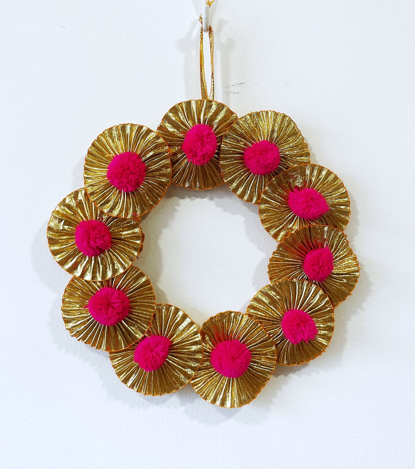 - Description:Gota work wreath with wool micro-pompom
