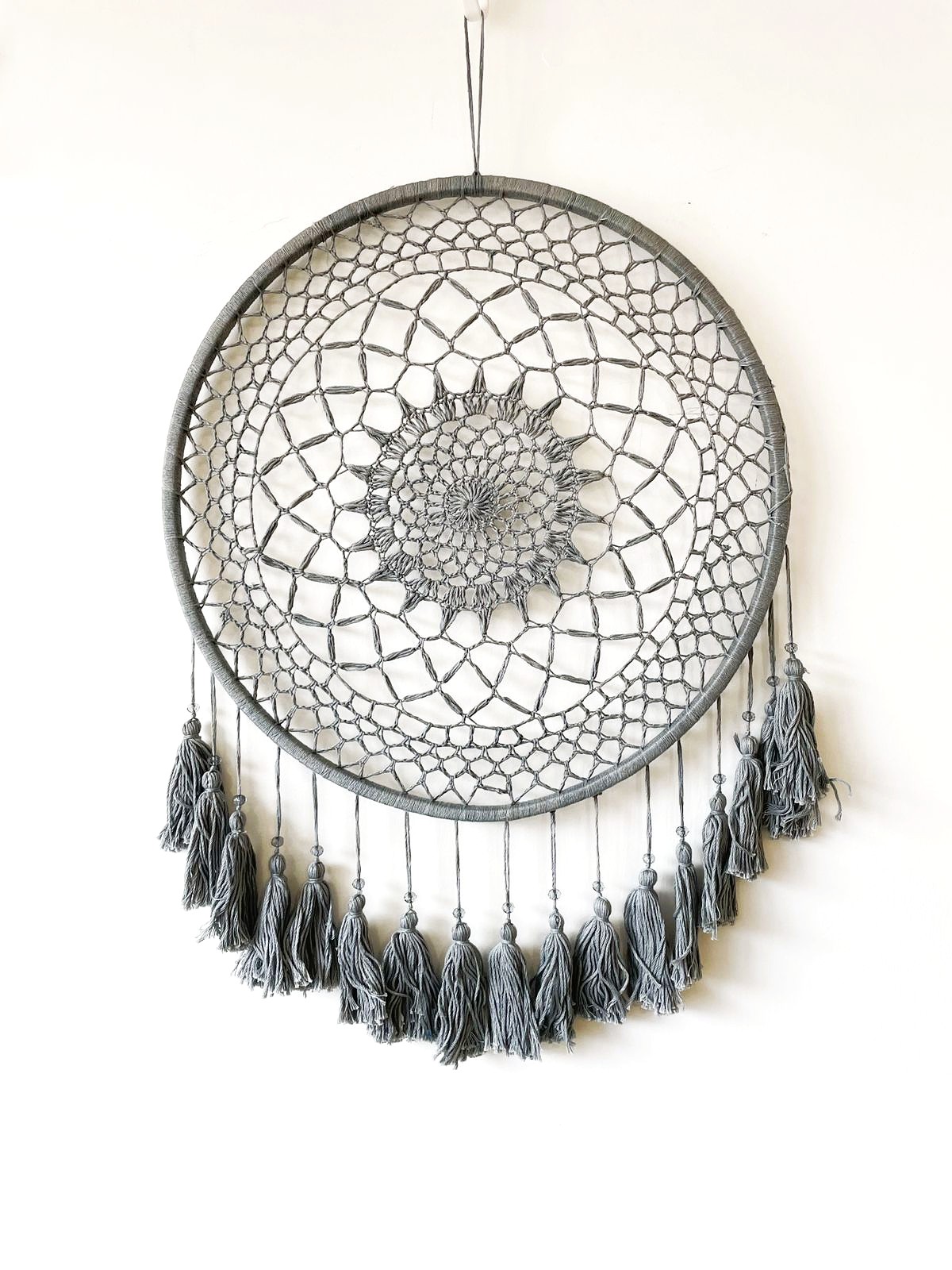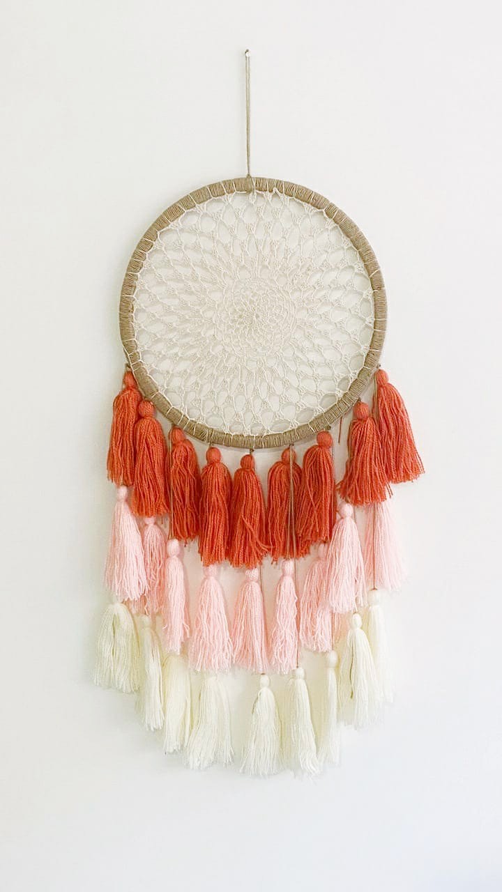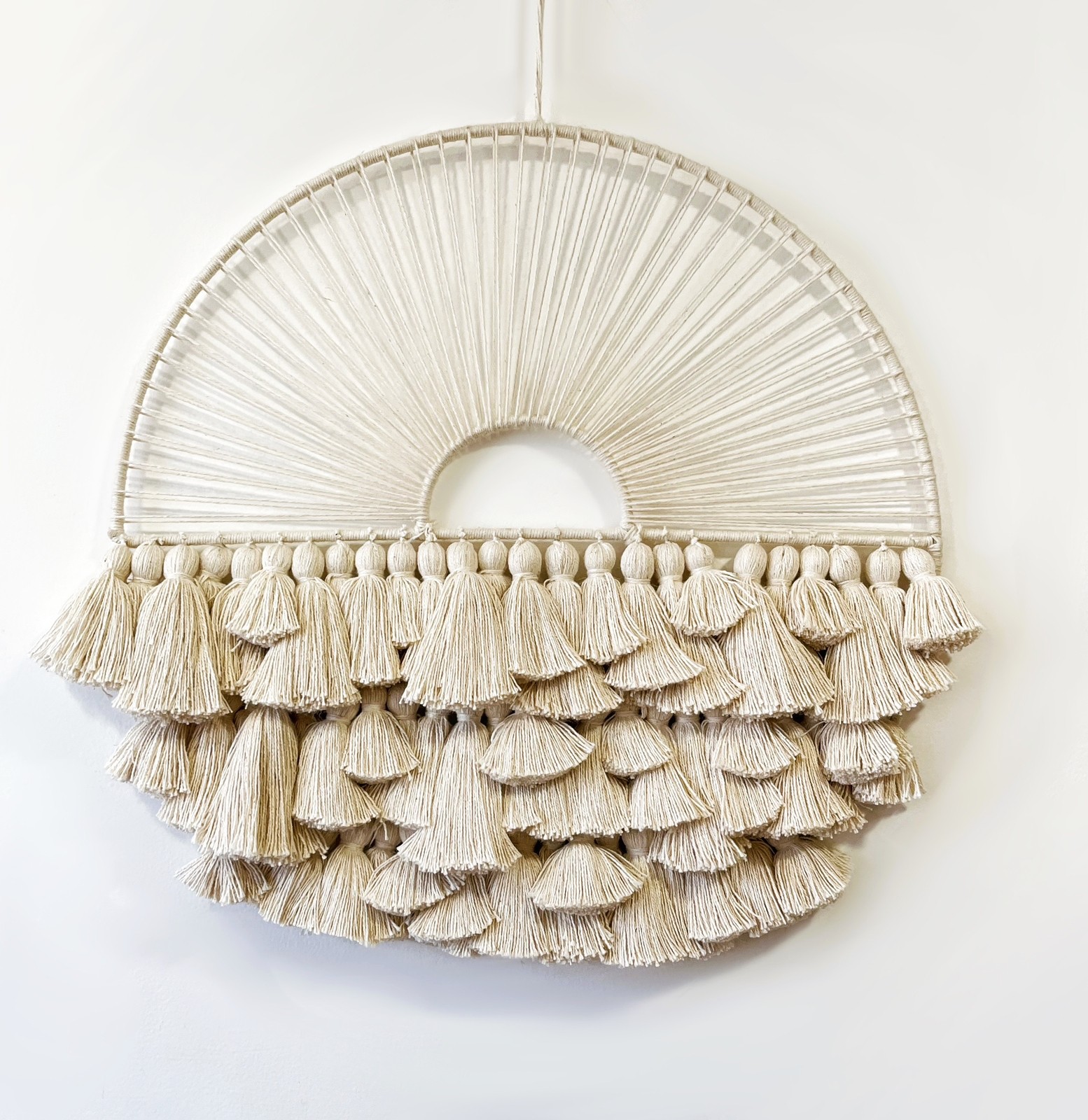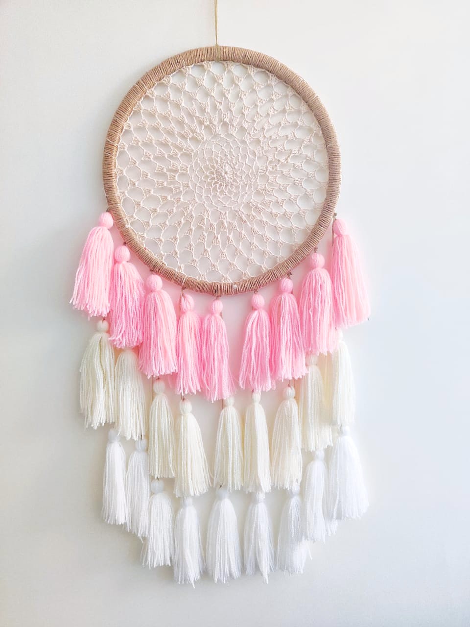 - Description: Wood/metal ring wrapped with jute/unwrapped, 100% cotton crochet center & blended wool tassels