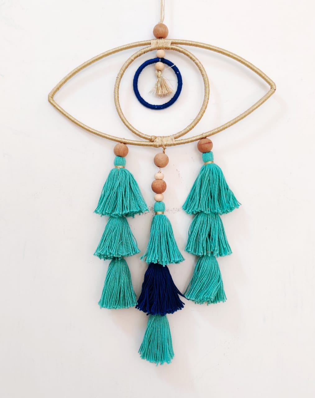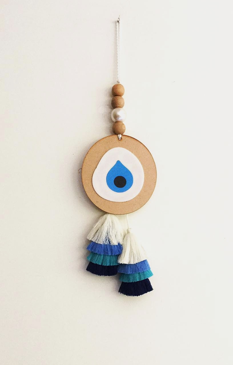- Description: Acrylic laser-cut evil eye on mdf backing with wool tassel extension and beads