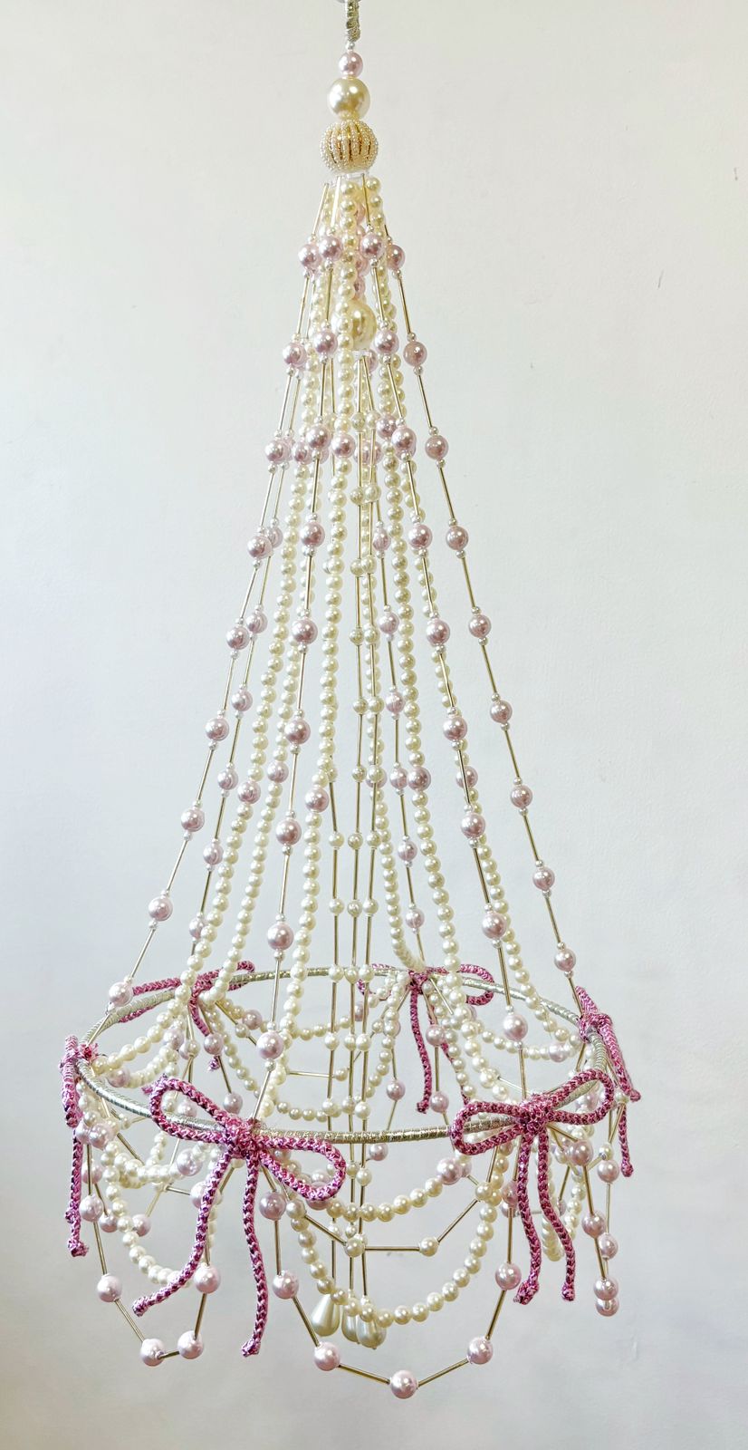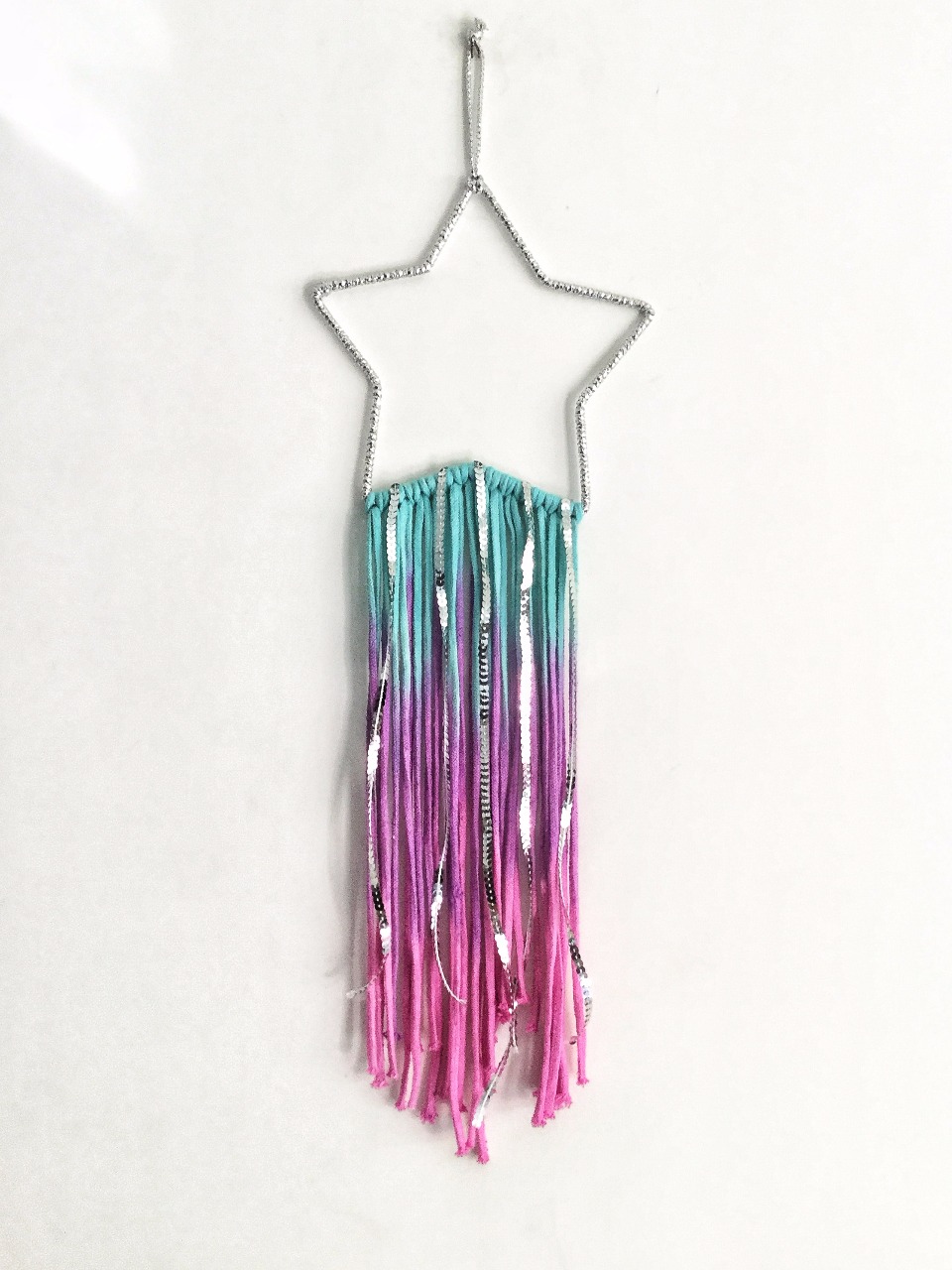 - Description: Lurex wrapped frame with faux pearl & tie-dyed cotton yarn extensions